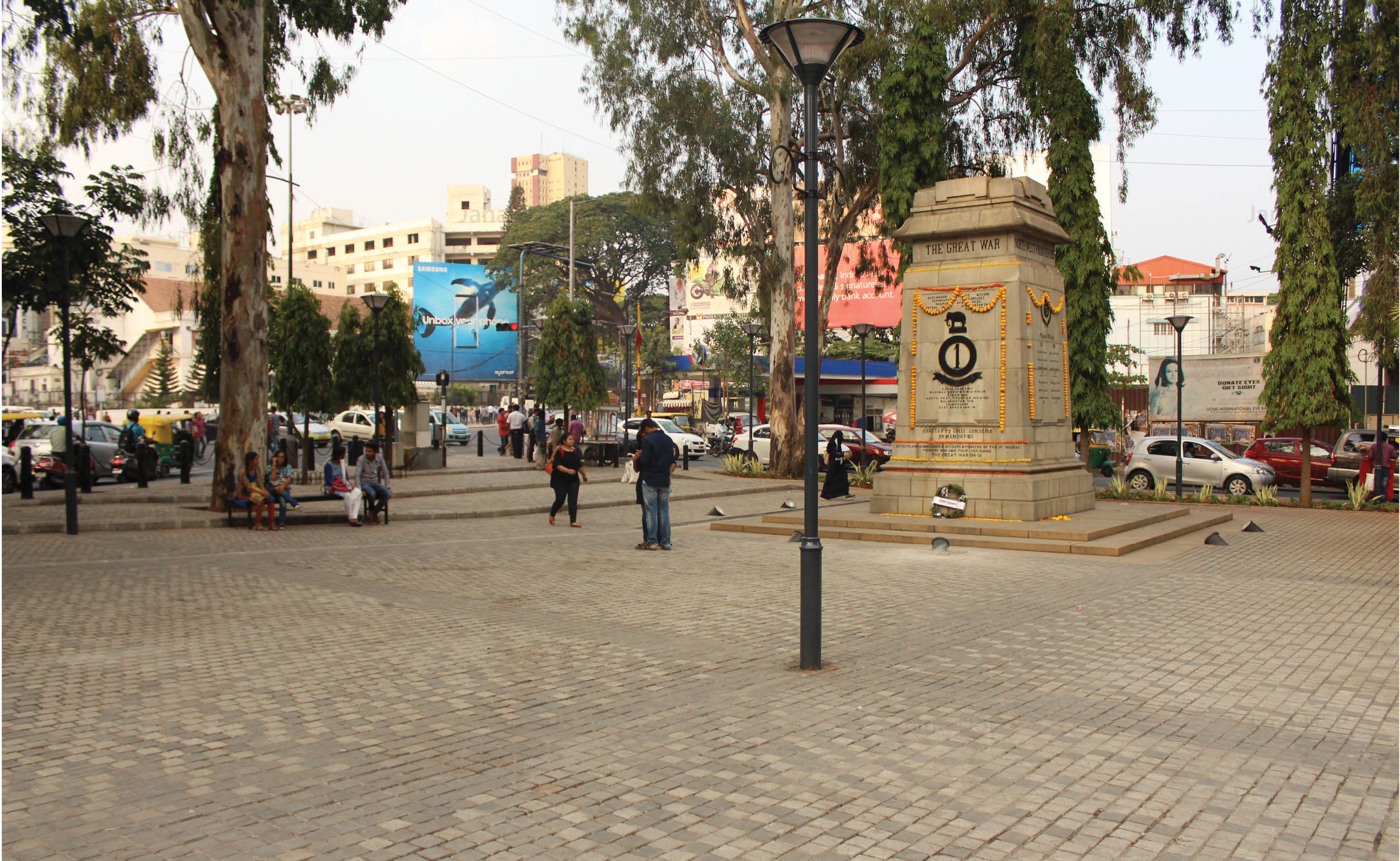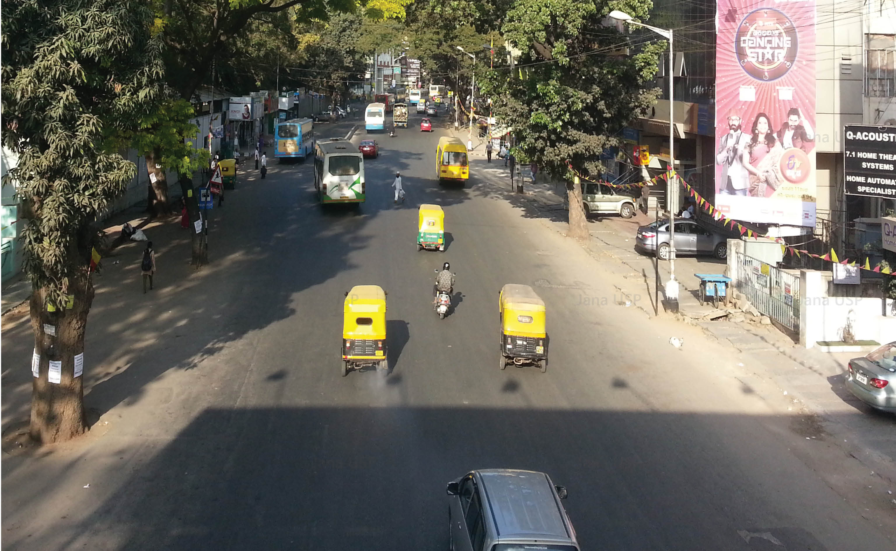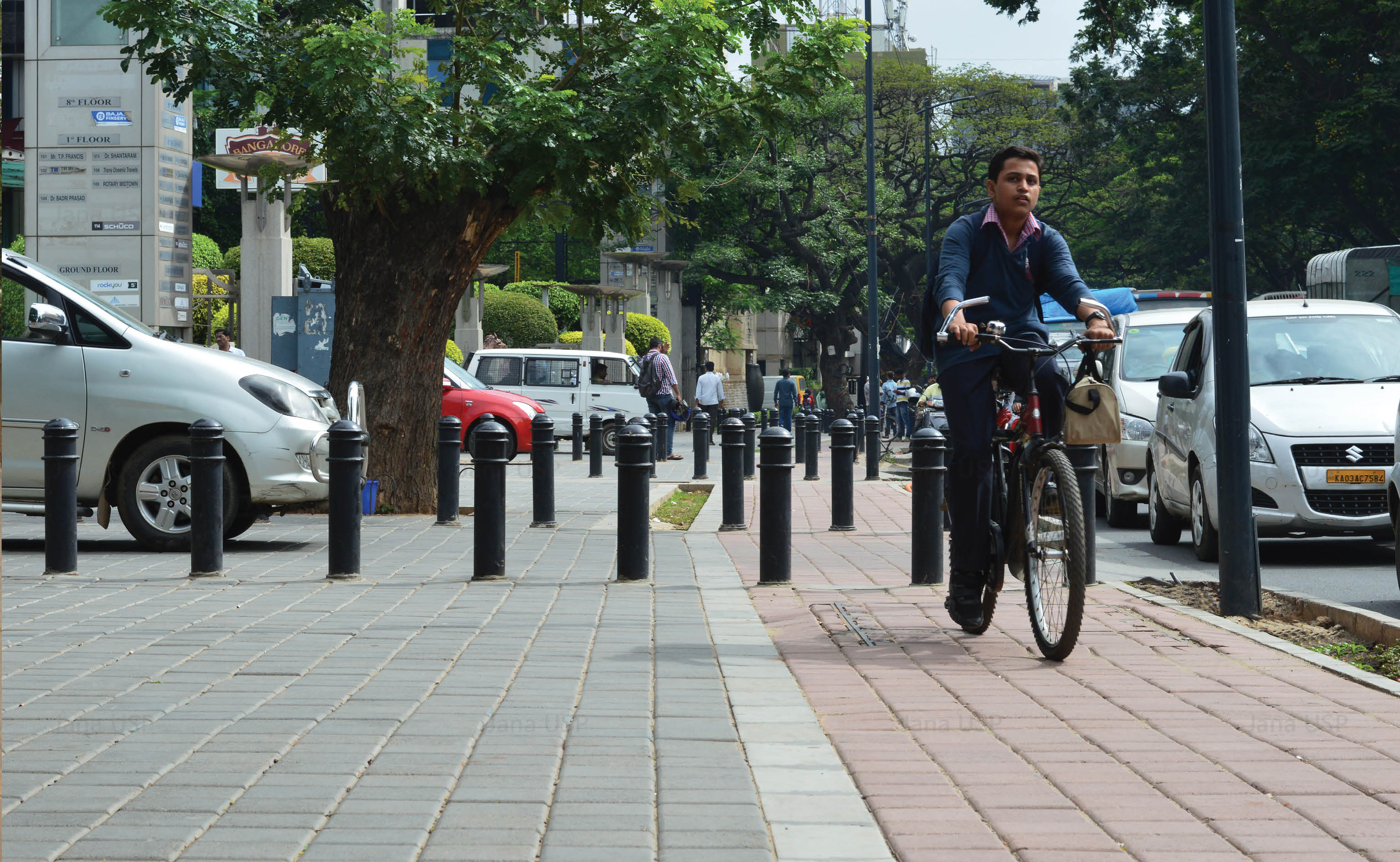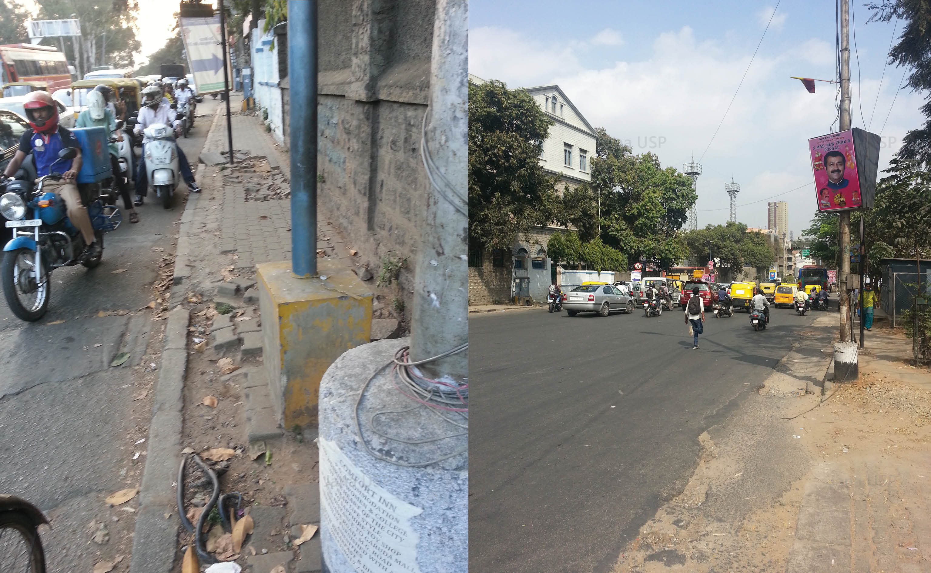 After Tender SURE, based on traffic volume and carrying capacity, the road has been divided into two sections. The first segment from Richmond Circle to Cariappa Circle supports 4 travel lanes of uniform width. Both sides of the road have evenly paved continuous footpaths separated from other forms of movement by landscape strips. There is a cycle track on one side of the road, and organized street parking on the other side along with a 65M long bus bay.